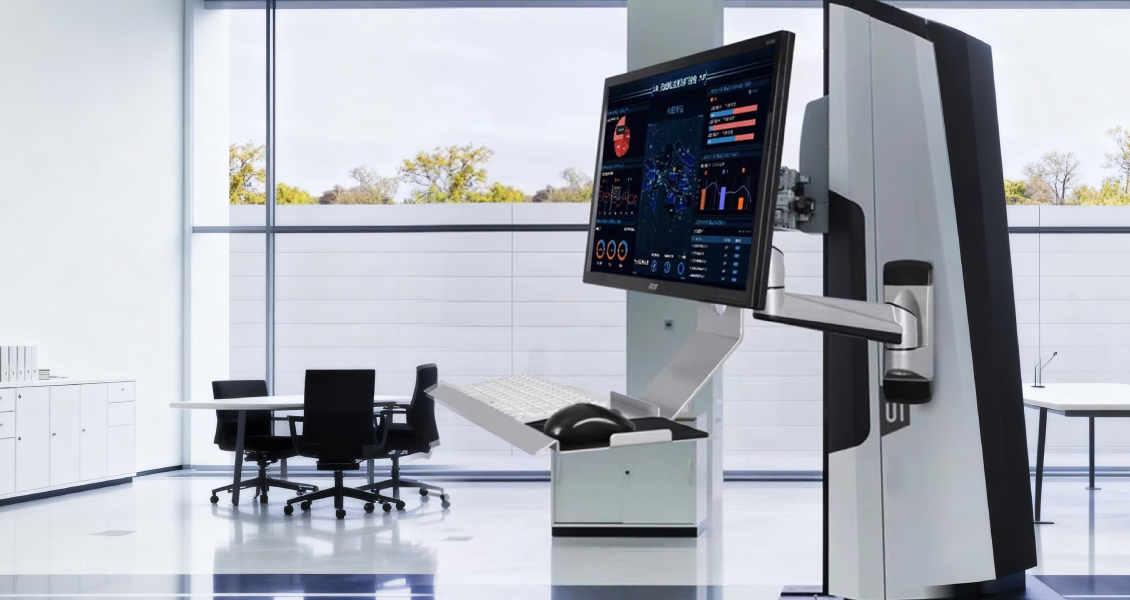 This heavy-duty wall-mount station features a full-motion articulated arm for optimal screen positioning and an integrated keyboard/mouse tray. Designed for control rooms and offices, it saves space, supports dual monitors, and ensures a clean, ergonomic setup with robust VESA compatibility.