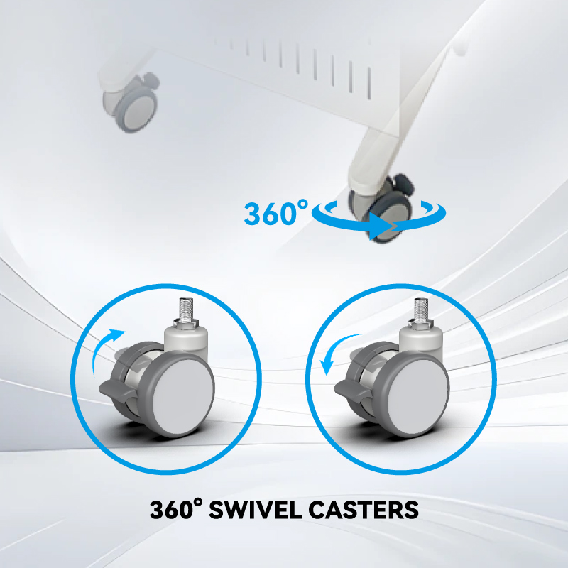 The Likaymo laptop cart is equipped with four 3-inch diameter 360° swivel wheels, complete with foot-activated brakes for smooth mobility and secure positioning. The large wheels easily overcome thresholds and carpet transitions, providing effortless maneuverability across various floor types in clinics, hospitals, or salons. Combined with a sturdy frame, the cart remains stable during use, and the locking wheels ensure it stays firmly in place when stationary.