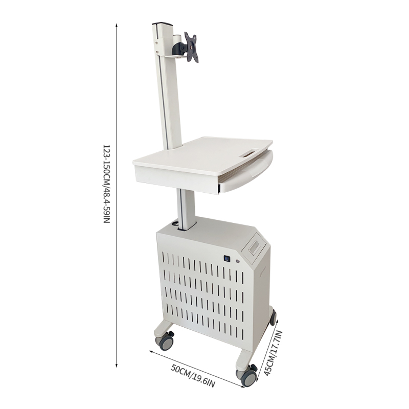 This medical cart features a height-adjustable column supporting a digital display for real-time patient data monitoring. Its streamlined design includes a slide-out keyboard tray and sturdy mobile base with lockable casters for clinical mobility.