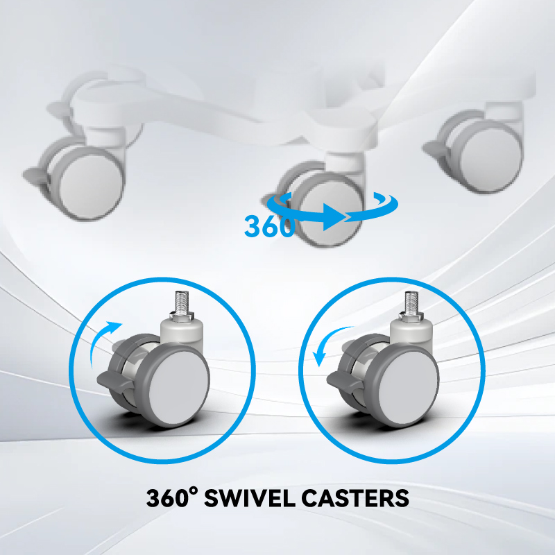 The Likaymo laptop cart is equipped with four 3-inch diameter 360° swivel wheels, complete with foot-activated brakes for smooth mobility and secure positioning. The large wheels easily overcome thresholds and carpet transitions, providing effortless maneuverability across various floor types in clinics, hospitals, or salons. Combined with a sturdy frame, the cart remains stable during use, and the locking wheels ensure it stays firmly in place when stationary.
