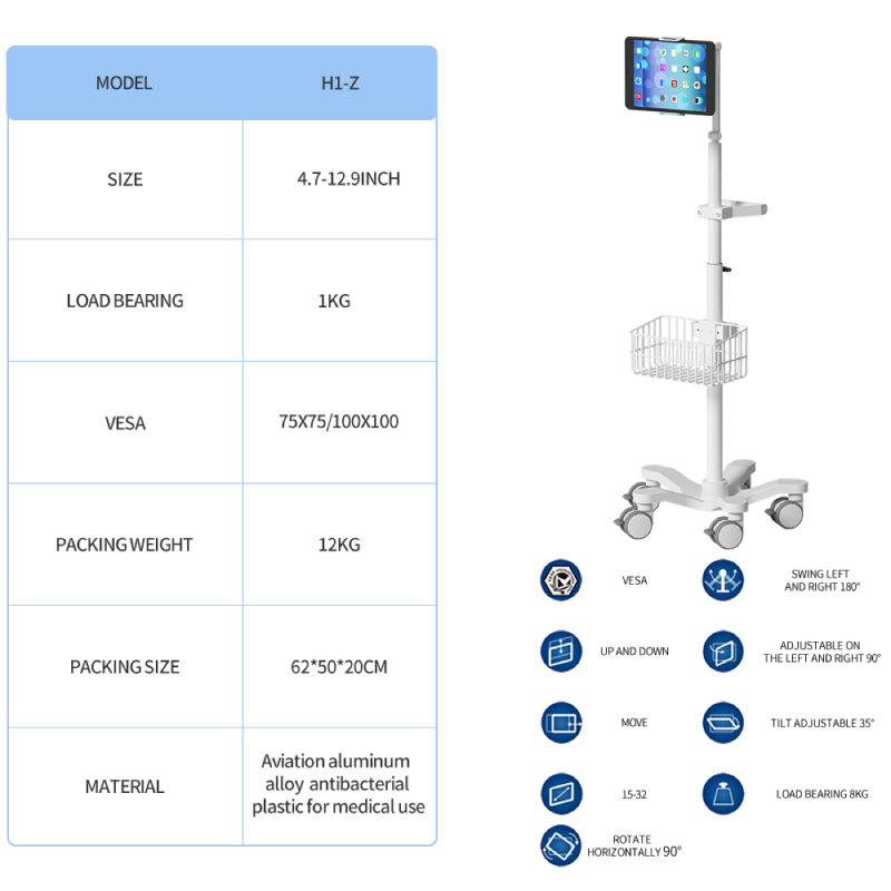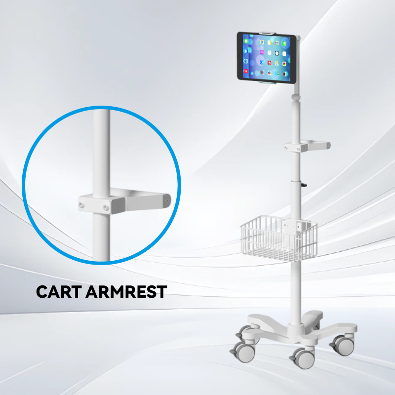 A sleek, mobile medical cart with a five-wheel base for stability, featuring a secure tablet holder and an adjustable storage basket. Designed for efficient point-of-care workflows in modern healthcare settings.