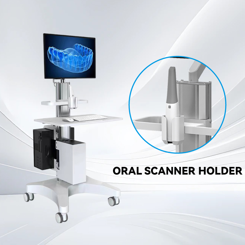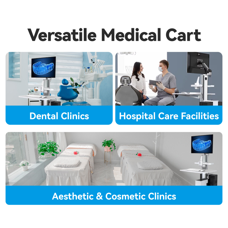 A mobile dental cart with integrated PC, high-res display for 3D tooth models, and keyboard for efficient clinical diagnosis and treatment planning.