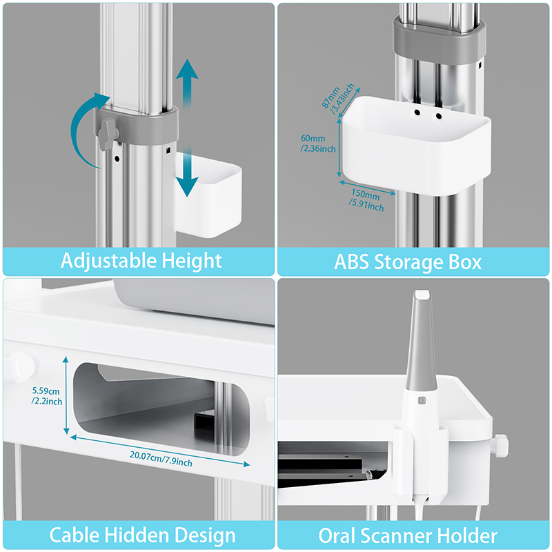 Customized for dental clinics, it serves as an essential mobile workstation for intraoral scanning and diagnosis. Dentists can move the cart to patient seats freely, placing oral scanners and laptops to quickly capture oral data, making it indispensable for digital dental restoration and orthodontic treatment processes.