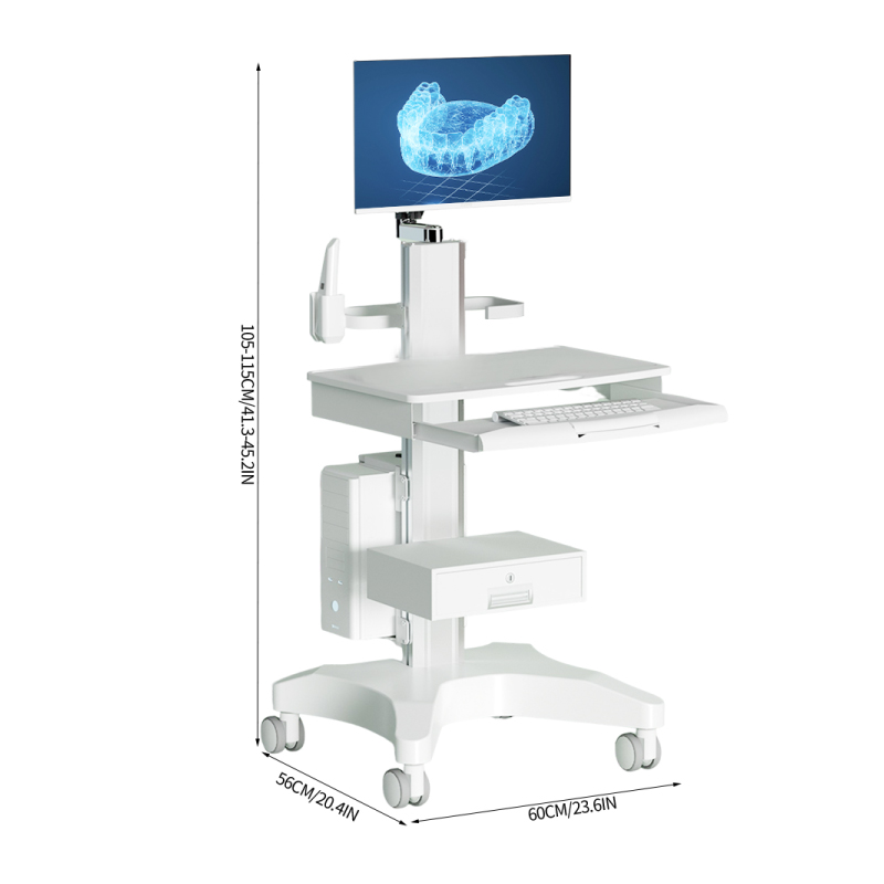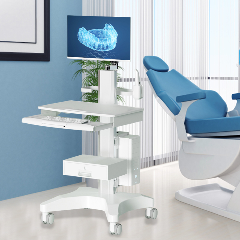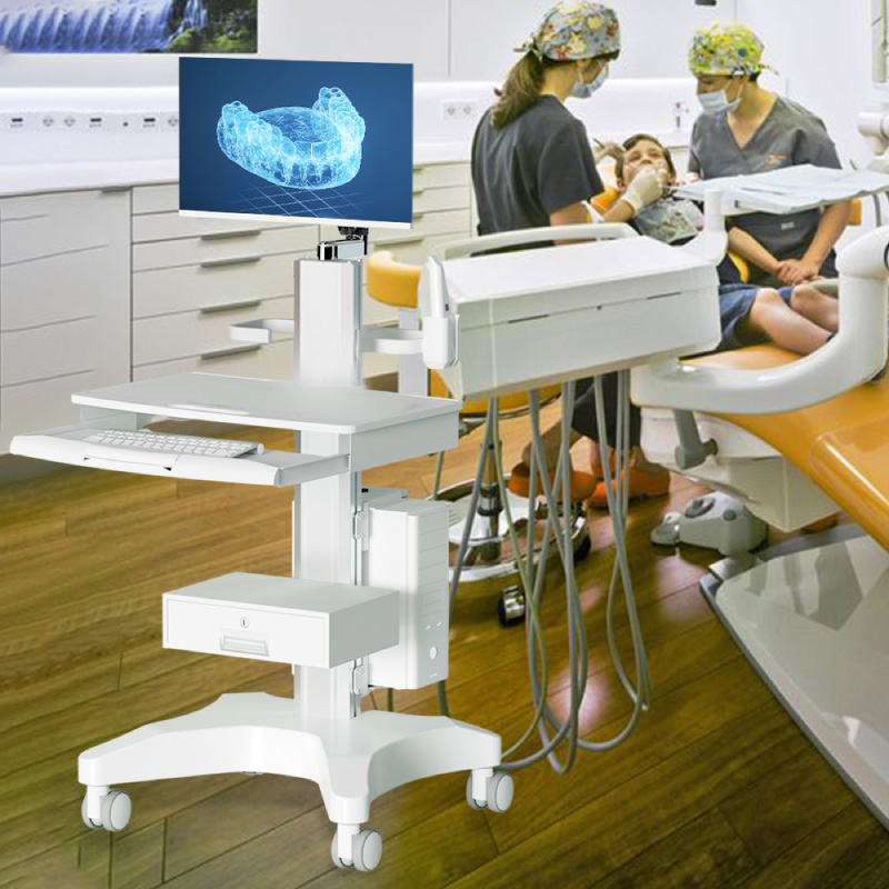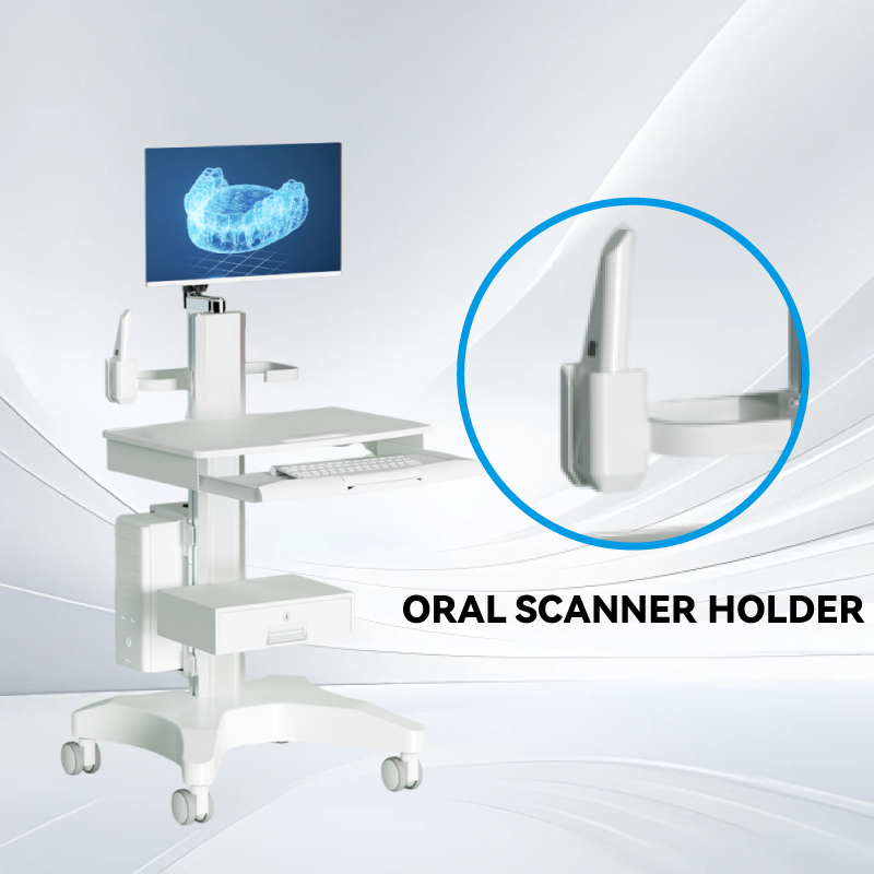 Medical cart equipped with lockable drawers, adjustable height, and a pneumatic arm that allows free movement with rotation in all directions, complete with an intraoral scanner holder.