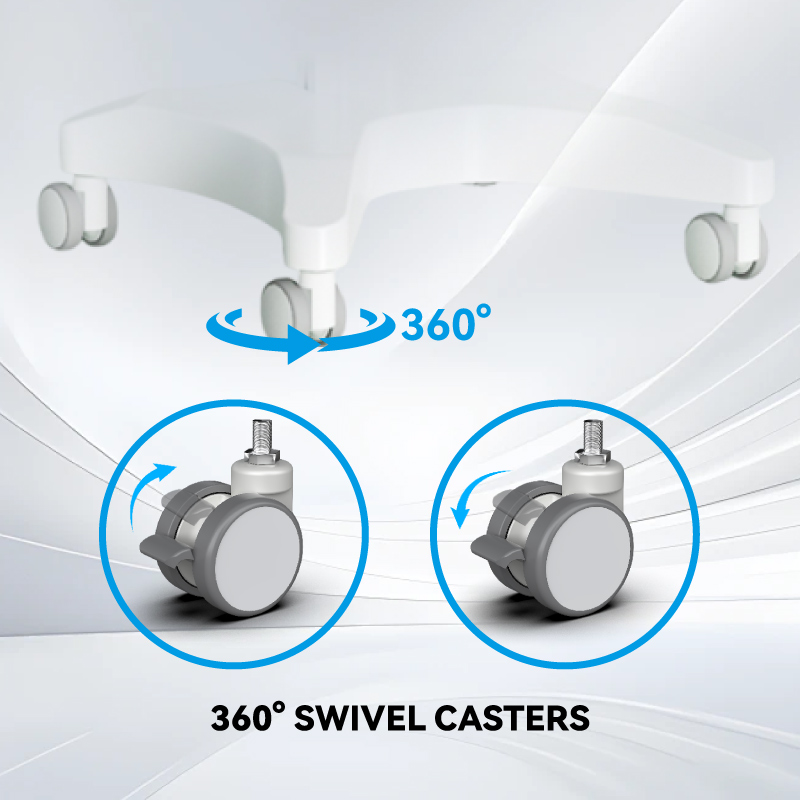 The Likaymo laptop cart is equipped with four 3-inch diameter 360° swivel wheels, complete with foot-activated brakes for smooth mobility and secure positioning. The large wheels easily overcome thresholds and carpet transitions, providing effortless maneuverability across various floor types in clinics, hospitals, or salons. Combined with a sturdy frame, the cart remains stable during use, and the locking wheels ensure it stays firmly in place when stationary.