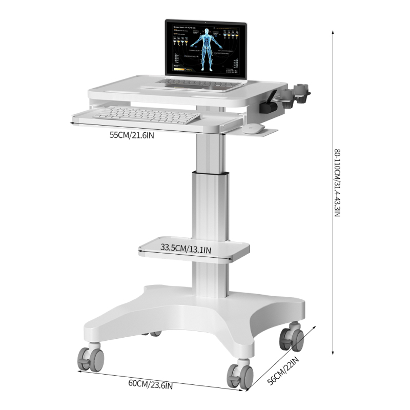 This sleek medical cart features a height-adjustable design with a built-in laptop displaying anatomical data. Its integrated keyboard tray and smooth-rolling casters support efficient point-of-care workflows in clinical environments.