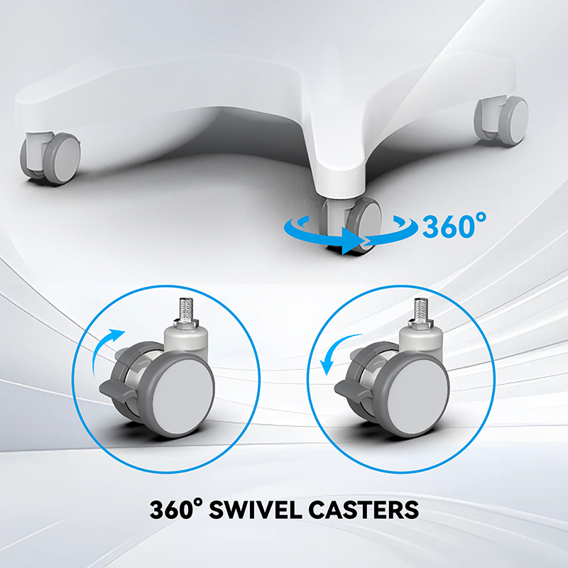 The Likaymo laptop cart is equipped with four 3-inch diameter 360° swivel wheels, complete with foot-activated brakes for smooth mobility and secure positioning. The large wheels easily overcome thresholds and carpet transitions, providing effortless maneuverability across various floor types in clinics, hospitals, or salons. Combined with a sturdy frame, the cart remains stable during use, and the locking wheels ensure it stays firmly in place when stationary.