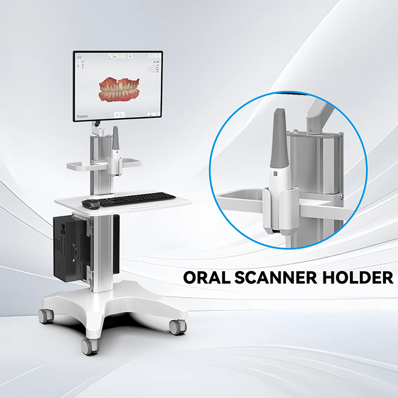 This mobile medical cart features a dedicated, secure holder for oral scanners. It streamlines digital workflows by keeping essential imaging equipment organized and mobile, enhancing clinical efficiency and patient care. Its ergonomic design ensures seamless integration into any dental practice