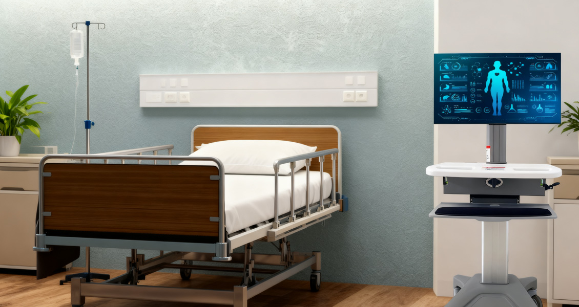 The keyboard tray features a front-pull sliding mechanism with a circular handle for easy access. It includes an integrated wrist rest for ergonomic comfort during prolonged data entry, and smoothly extends to an optimal typing position to enhance clinical workflow efficiency.
