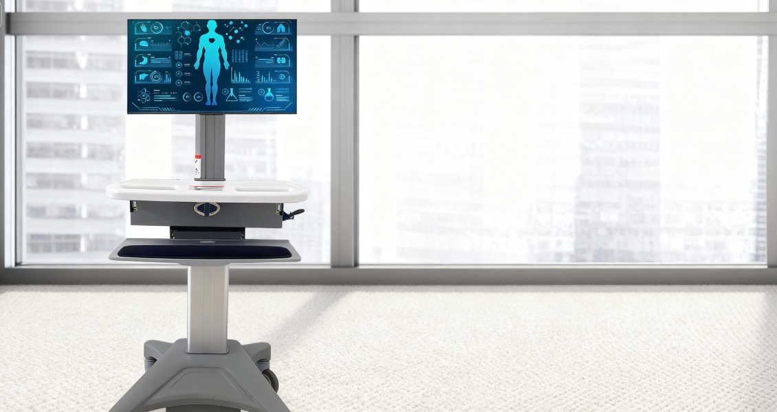 This electric medical cart features a battery-powered design for cordless mobility, with an adjustable monitor on an articulating arm, a spacious work surface, and integrated storage for clinical use during rounds.