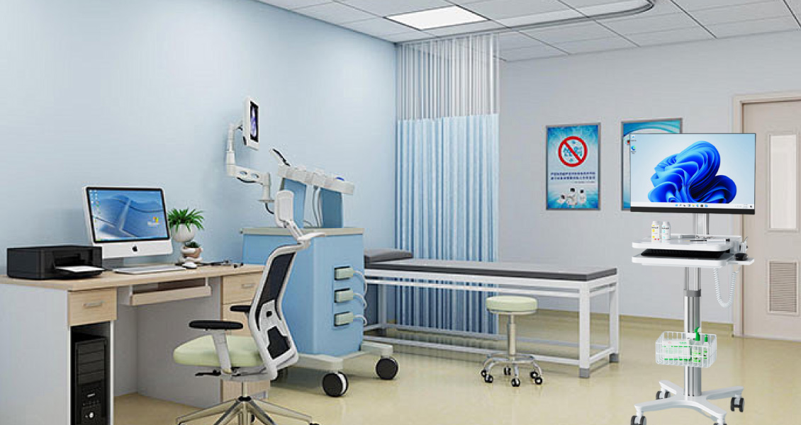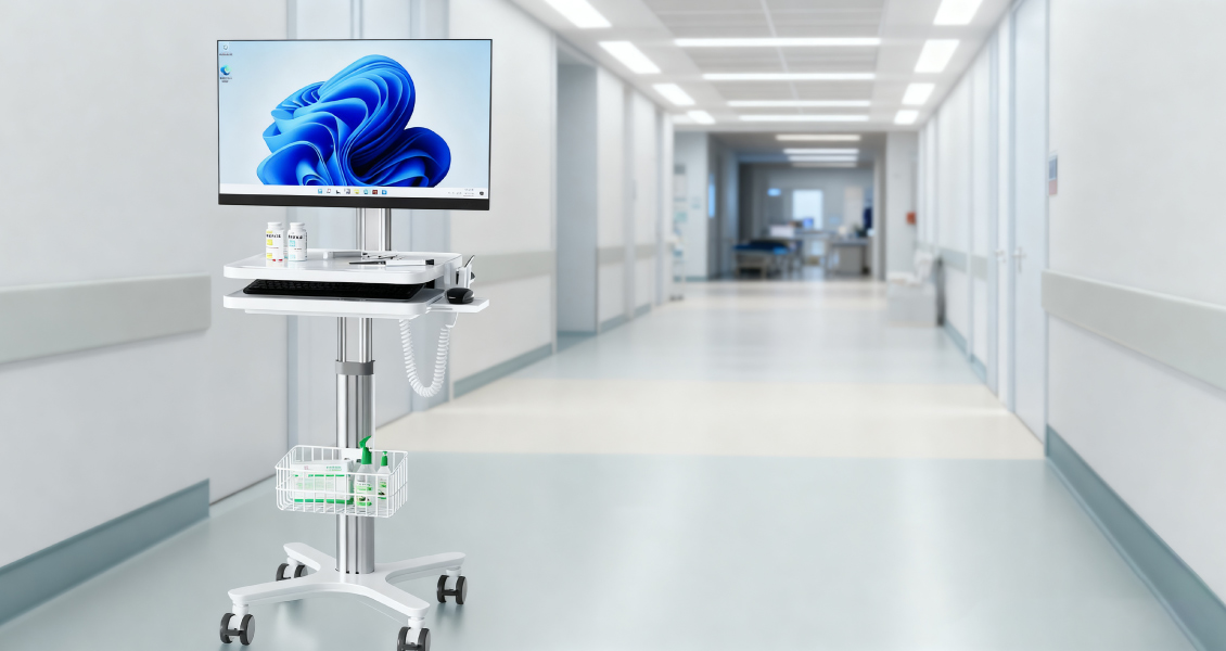 This medical cart features a height-adjustable column supporting a digital display for real-time patient data monitoring. Its streamlined design includes a slide-out keyboard tray and sturdy mobile base with lockable casters for clinical mobility.