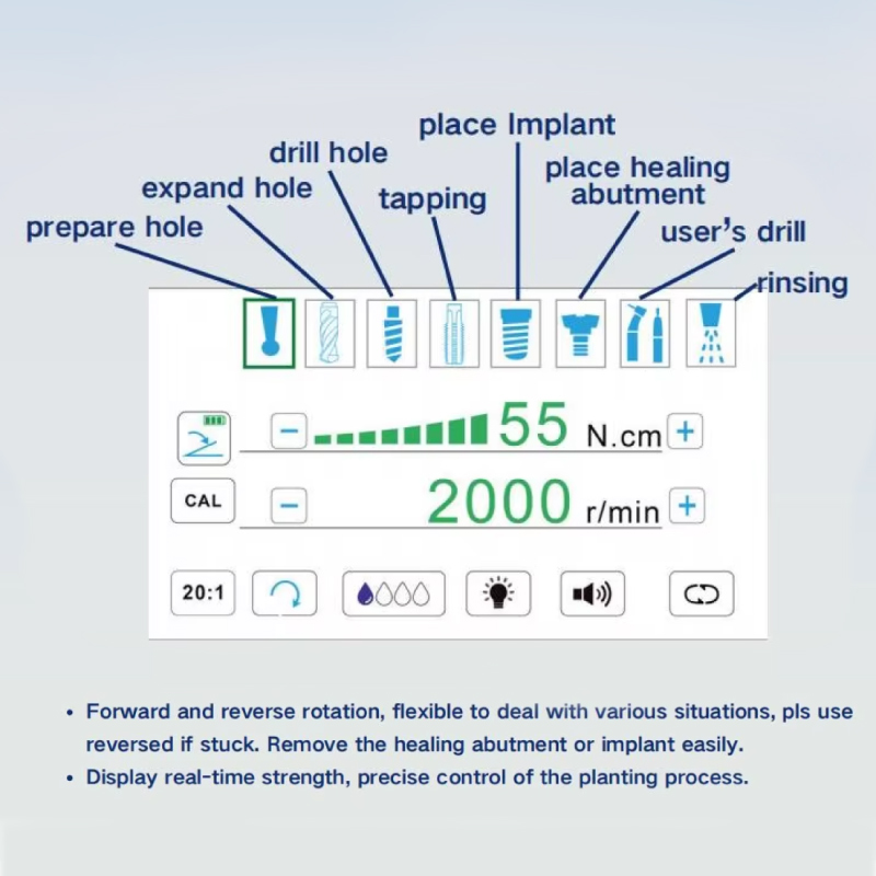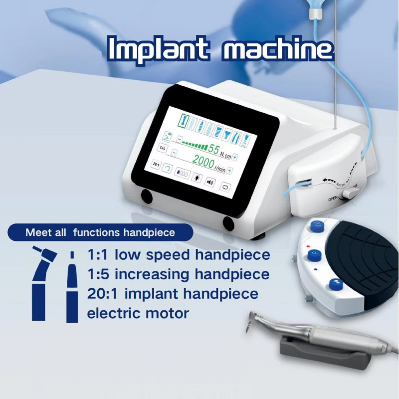 This professional implant machine is engineered to deliver full surgical versatility through its integrated handpiece system. It includes three specialized attachments to cover the entire workflow:
