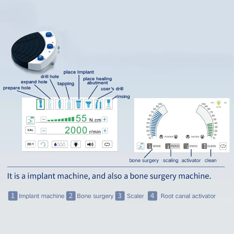 4-in-1 dental system integrates implants, bone surgery, scaling & endo activation. Features 55N.cm torque, 2000 RPM speed, real-time display, and forward/reverse rotation. Complete with implant handpiece, surgery tools, and accessories—an all-in-one professional solution for modern clinics.