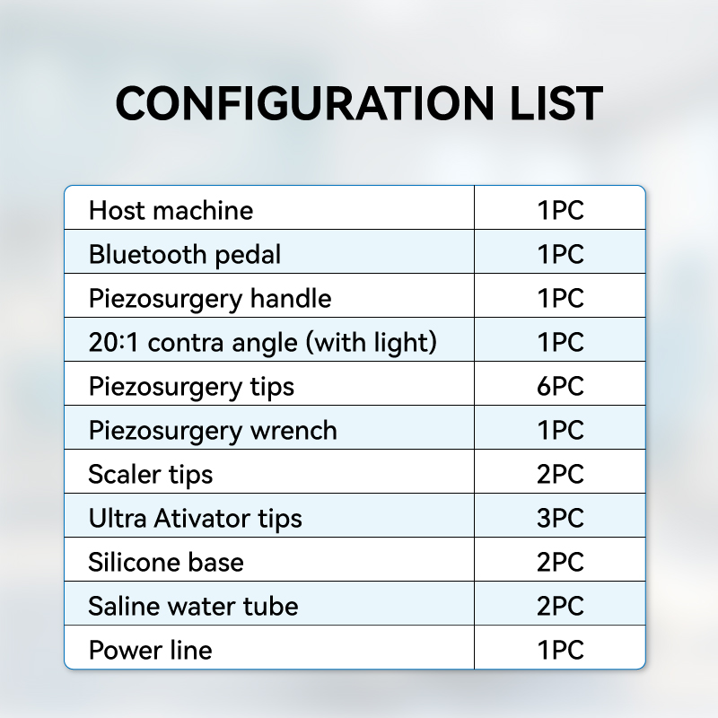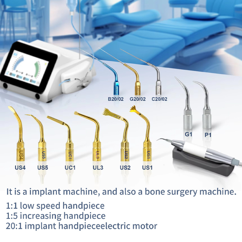 This unit is a versatile dental implant and bone surgery machine that integrates multiple functions into one professional system. It is designed to accommodate a wide range of procedures through its modular handpiece system, including US1–US5 ultrasonic scalers, UC1 and UL3 endo/periodontal tips, and surgical attachments.