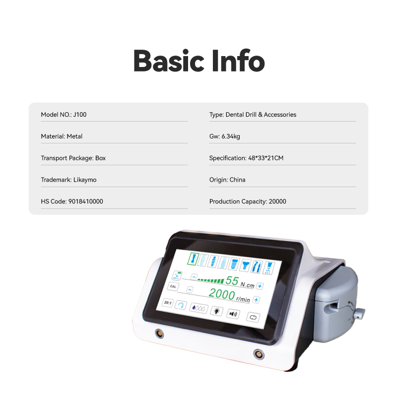 The J100 is a professional all-in-one dental implant and surgical system. Built with durable metal components, it is compact (packaged in a 48*33*21cm box, 6.34kg) and integrates seamlessly into clinics. Manufactured under the Likaymo brand in China, it meets international standards and supports implants, bone surgery, scaling, and endo activation in one efficient device.