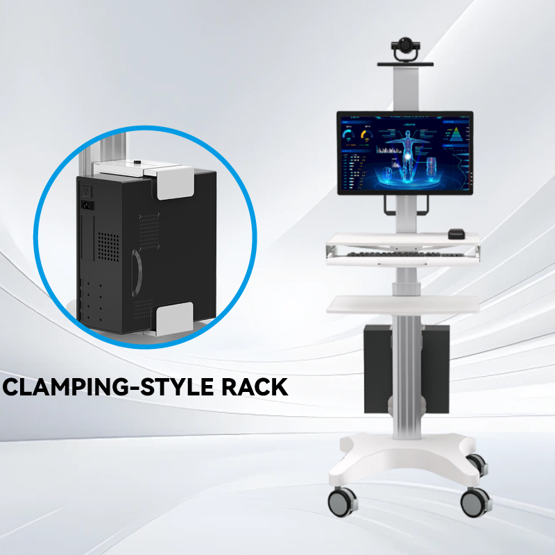 Designed for medical carts, this heavy-duty clamp-mounted rack offers secure and organized assembly solutions for computer hosts and other critical processing equipment. The reinforced clamping structure ensures anti-vibration and firm fixation, effectively preventing movement or dislodging during transportation and daily operation. Tool-free installation enables quick setup and flexible adjustments for easy integration into varied clinical settings. By stabilizing devices and maintaining accessibility, it helps enhance workflow efficiency and equipment safety.